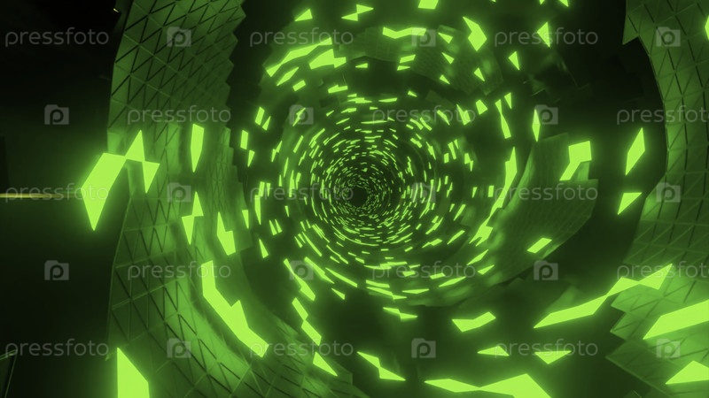 3D зеленый научно-фантастический технологический тоннель, закрывающийся фон движения. Дизайн. Движение внутри сияющего бесконечного научного коридора