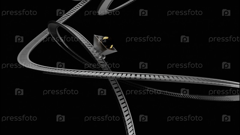 Абстрактная небольшая серебряная тележка с коричневой сферой внутри очень быстро катится по рельсам. Дизайн. Необычный маленький вагон со светящимся шаром, движущимся на изгибающихся рельсах, изолированных на черном фоне