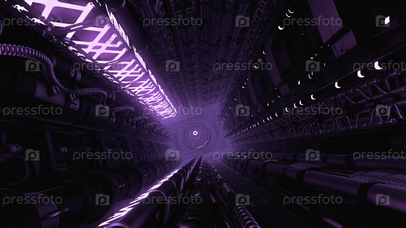 Технологический туннель в футуристическом корабле Движение 3D-пространство с трубами и неоновым светом в технологическом тоннеле Futuristic Spaceship Tunnel