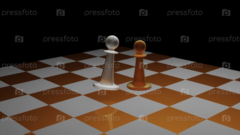 Шахматы в абстракции. Дизайн. Игра из белых и оранжевых фигур, которые поднимаются, а белые разбивают противника на шахматной доске