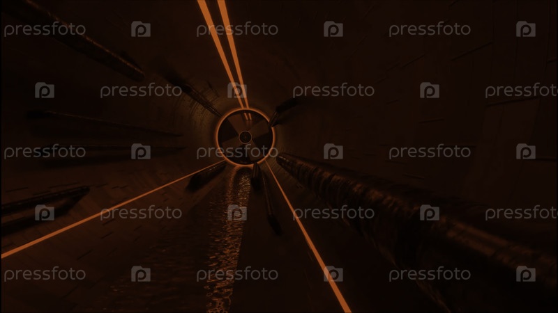 Абстрактная городская канализация в красном тусклом освещении.Дизайн.Перемещение внутрь туннеля круглой формы с течением сточных вод к люку для вентиляции