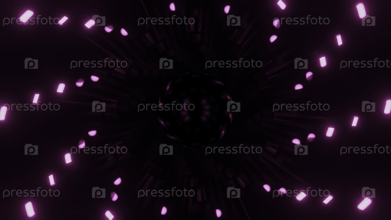 Светящиеся точки вращаются в спирали на темном фоне. Дизайн. Технологическая спираль с вращающимися неоновыми точками во тьме. Неонные фонари движутся в спиралах во тьме