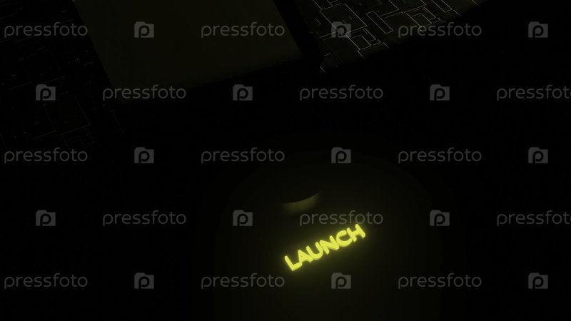 Светящаяся кнопка запуска 3D. Дизайн. Кнопка для загрузки компьютерной системы в темное время суток. Неоновая табличка старта с кнопкой компьютера