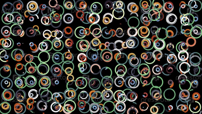 Абстрактные движущиеся узкие линии, образующие множество кругов, раскачивающихся на черном фоне, бесшовная петля. Красочные круглые фигуры, кольца хаотично распределяются
