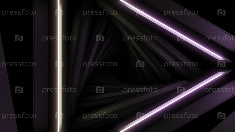 Треугольный 3D-туннель с мигающими линиями. Дизайн. Поворачивающийся 3D-тунел с треугольниками и светящимися линиями. Темный треугольник с мерцающими огнями