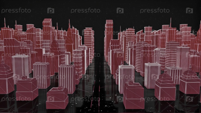 Розовый изометрический городской пейзаж на черном космическом фоне с летающими белыми частицами. анимация. красочный контрастный проект города
