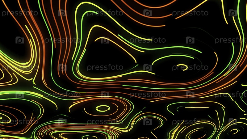 Черный фон. Движение. Яркие многоцветные линии сияют и растягиваются, чтобы создавать узоры