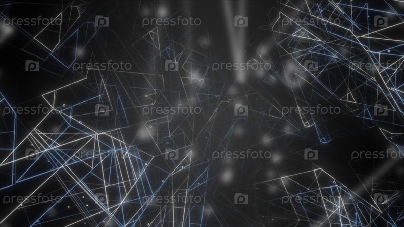 Черный фон.Движение.Бело-синие линии в графике летают к хаотичным местам в 3D формате