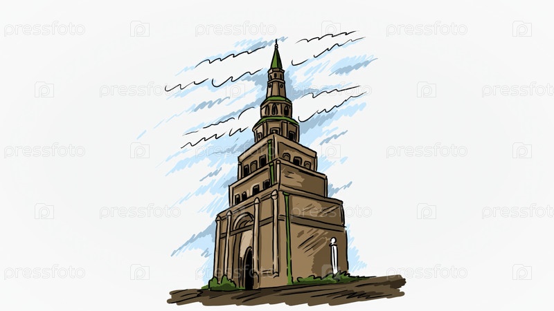 Башня Соембика в Казанском Кремле, Россия, представлена как яркая наклонная башня рисунок