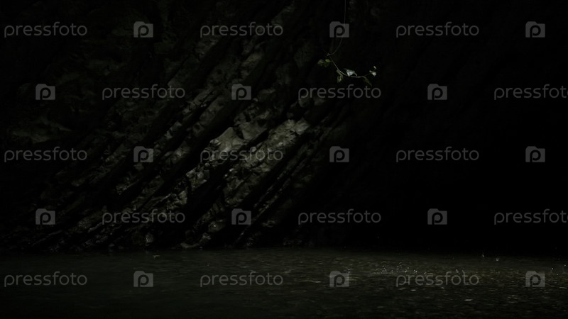 Огромная скала, из которой холодные капли капают в пруд снизу