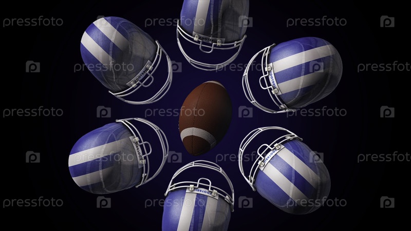 Абстрактная анимация мяча регби и голубо-белых хамелетов, вращающихся и образующих круг, изолированные на черном фоне