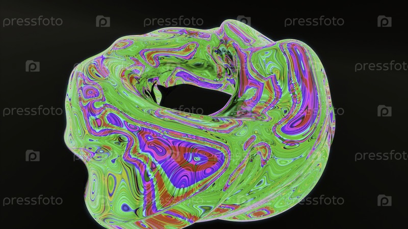 Абстрактная вращающаяся трансформация и изменение фигуры тора, изолированной на черном фоне. Дизайн. Поворачивающаяся неоновая красочная фигура
