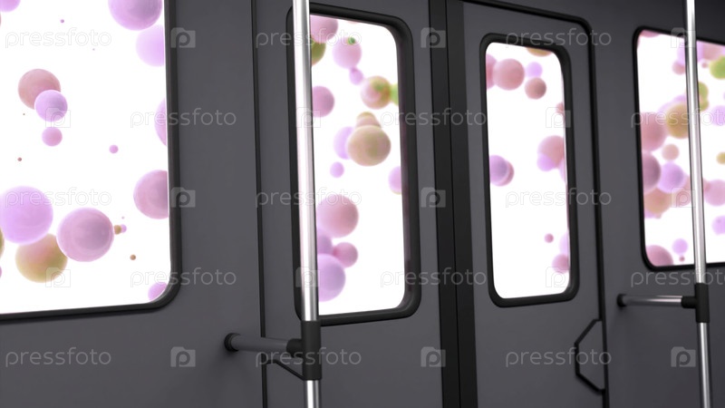 Сюрреалистическая анимация воздушных шаров, летящих за окнами общественного транспорта. Дизайн. Вид из автобуса на окнах со многими розовыми воздушными шариками