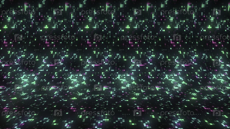 Фон сверкающих квадратов со изгибом. Движение. Красивый фон с кривой и движущимися мерцающими квадратами. Цветный мигающий рисунок квадратных пикселей