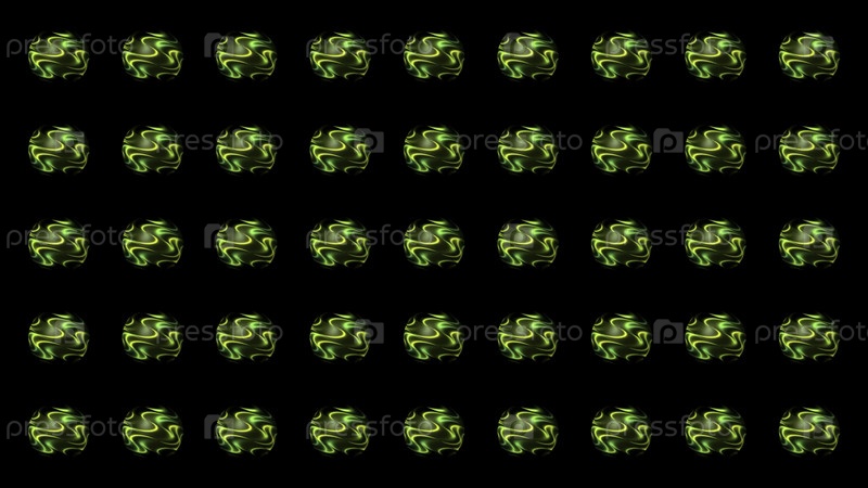 Многие абстрактные 3D сферы в симметричных рядах с узором зеленых волн, бесшовная петля. Движение. Энергия вибрирующих светящихся шаров