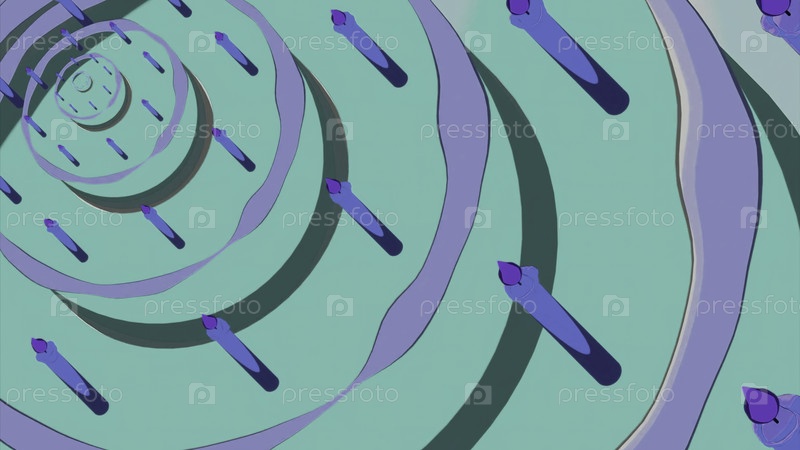 Абстрактная анимация торта на день рождения. Дизайн. Круги движутся в потоках с изображением торта. Праздничная анимация с тортом и свечами