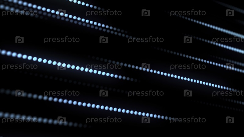 Поток светящихся линий из точек. Движение. Яркий поток бинарных неоновых линий на черном фоне. Красивый неонный поток цифровых точечных линий