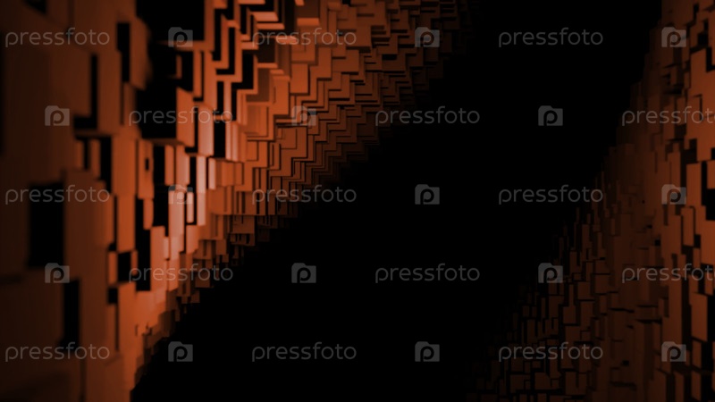 Пикселированный фон с полетом внутри темного тоннеля. Дизайн. Ряд кубических форм, света и тени