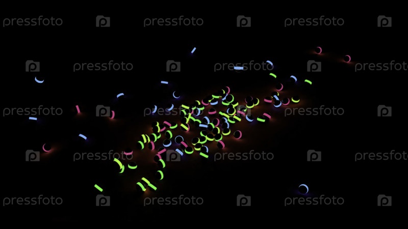 Цветные блестящие шарики падают и качаются на черном фоне. Дизайн. Многие чернокожие дети играют в шары с неоновыми огнями, которые падают на пол