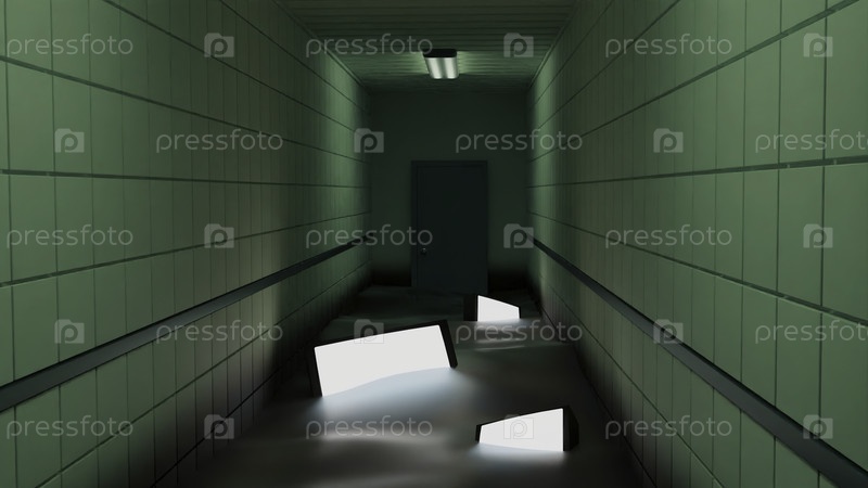 Светящиеся экраны в воде. дизайн. 3D коридор с водой и светящимися экранами. стильная футуристическая анимация с 3d-коридором и водой. затопленный коридор больницы