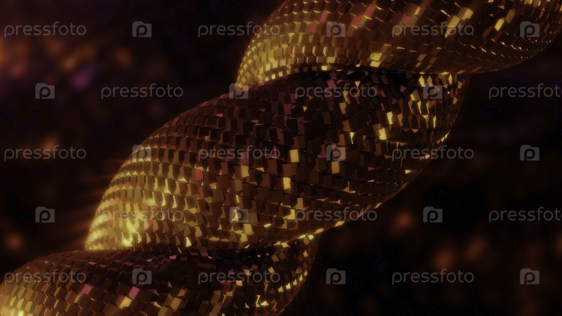 Яркая косуля, сплетенная на три части в абстракции.Движение.Три блестящих толстых линии прикреплены к катушке, которая мерцает и горит яркими оранжевыми оттенками