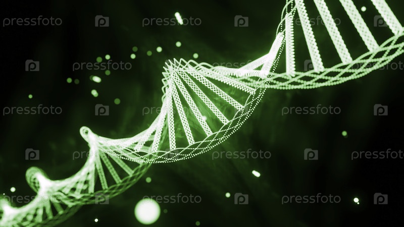 Виртуальные цепи ДНК и генов в вращающейся спирали. Красивая точечная спираль ДНК движется и вращается вместе с частицами цепочки