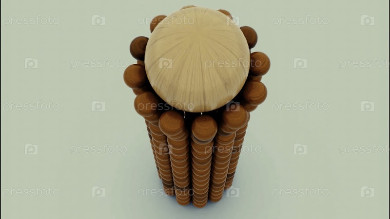 Небольшие коричневые деревянные сферы собираются вокруг светло-бежевого шара и поднимаются в форме столба.Дизайн.Создание колонны из небольших сфер