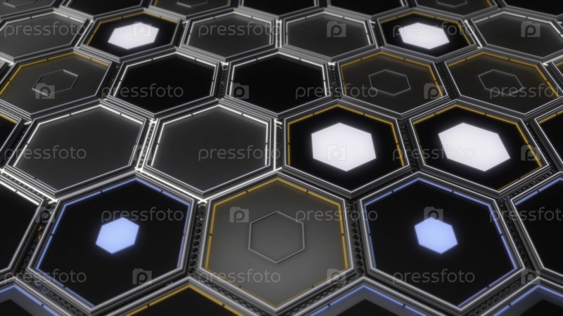 Абстрактные шестиугольники разных цветов в рядах, бесшовная петля. Ближе к плоским металлическим геометрическим фигурам с красочными лампами внутри