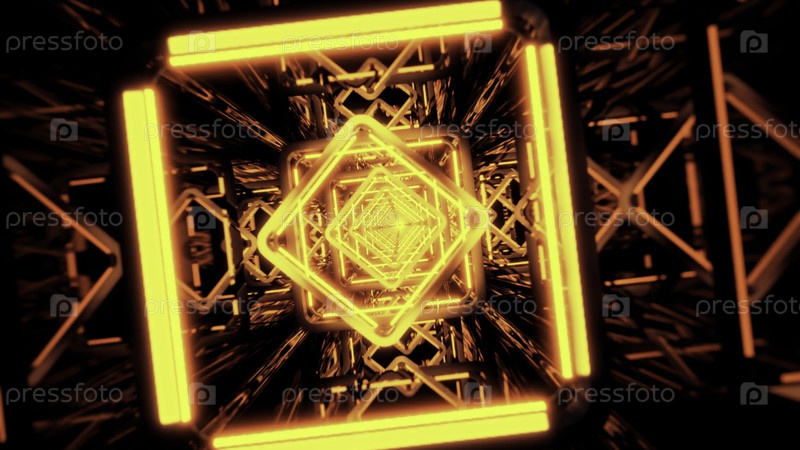 Оранжевые неоновые огни образуют бесконечный абстрактный квадратный туннель на темном фоне