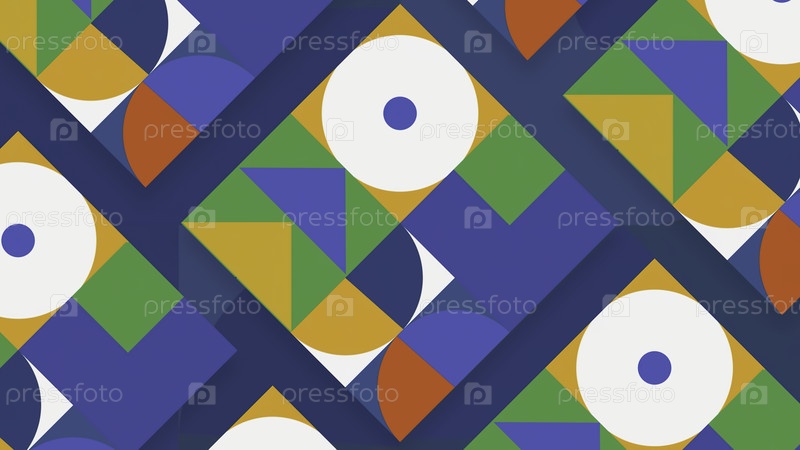 Красочный ретро орнамент с геометрическими формами. Движение. Модернистская анимация с многоцветными фигурами. Цветовые треугольники, квадраты и круги движутся в абстракции