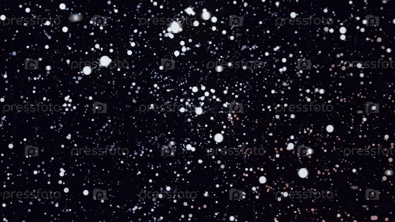 Многие круглые цветные частицы в пространстве движутся по кругу на черном фоне, бесшовная петля.Маленькие хаотичные точки красного, желтого и синего цветов летают во тьме