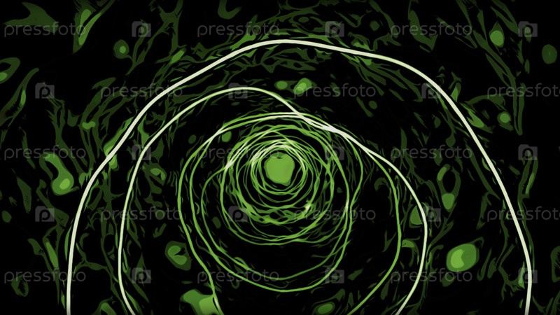 Зеленый и синий фон с белыми кольцами. Дизайн. Течение жидкости по бокам круглого тоннеля, выполненного в 3D-формате