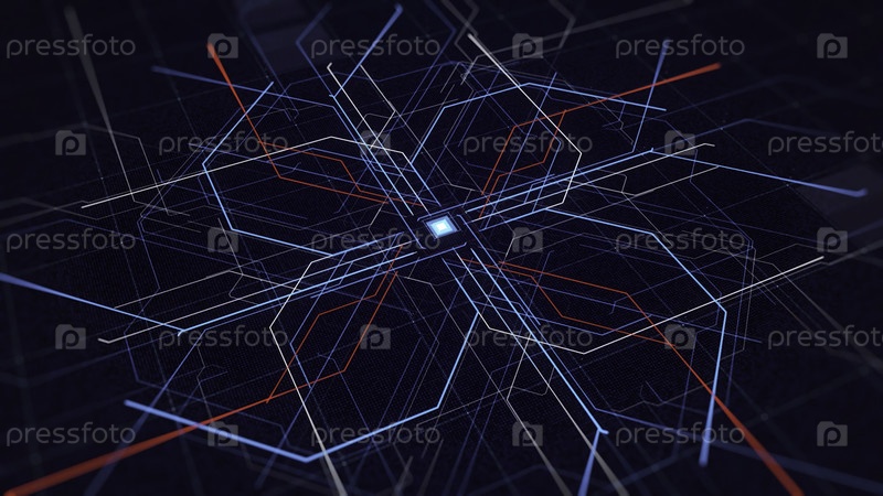 Компьютерная схема движущихся сетей Интернета. Анимация. Централизованная диаграмма с движущимися неоновыми линиями компьютерной системы. Нейронные сети интернета или компьютера
