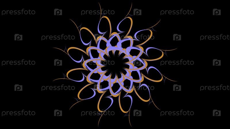 Цветочный цветный рисунок, вращающийся на черном фоне. Анимация акций. Абстрактный цветочный рисунок из красочных изогнутых линий, вращающихся на черном фоне