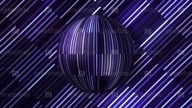 Вращающийся шар из блестящих линий. Движение. Красивый праздничный фон с вращающимся шаром и блестящими линиями. Блестящие вертикальные линии на цветном мяче