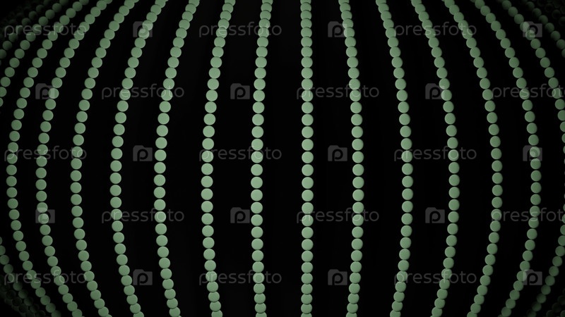 Абстрактные ряды небольших кругов, бегущих быстро и изгибающихся вокруг черного сферического объекта. Дизайн. Летучие полосы окружностей, бесшовная петля
