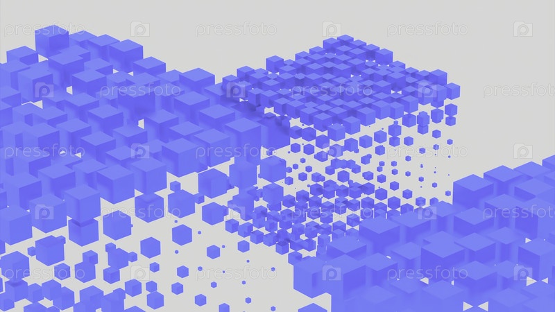 Дизайн. Цветные кубики в виртуальном пространстве двигаются вверх и вниз. Кубы разных размеров движутся в невесомости на белом фоне