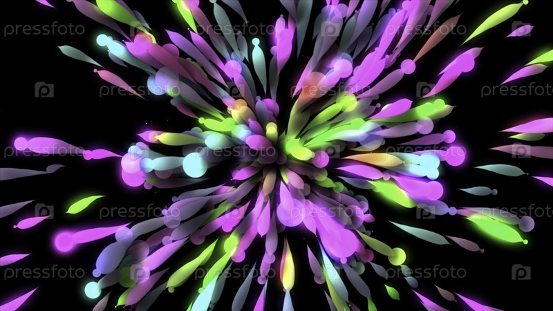 Цветные капли, движущиеся из одной точки во все стороны на черном фоне.Движение. Двигающиеся красочные пятна