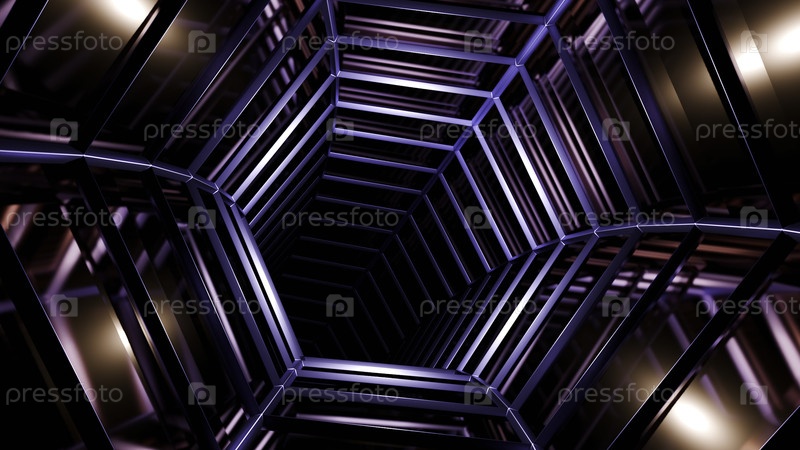 Потрясающий и завораживающий вид на сложный шестиугольный тоннель, который красиво освещен яркими неоновыми огнями