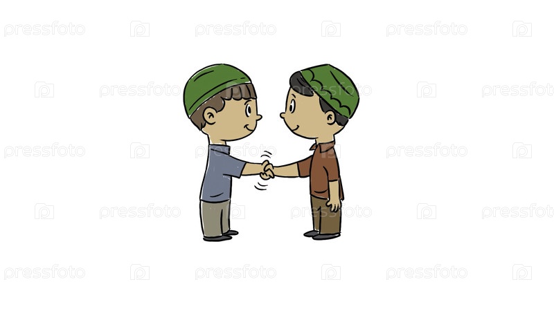 Два мультфильма о мусульманских мальчиках в зеленых куфах, рукопожатые друг другу, символизирующие дружбу и приветствие