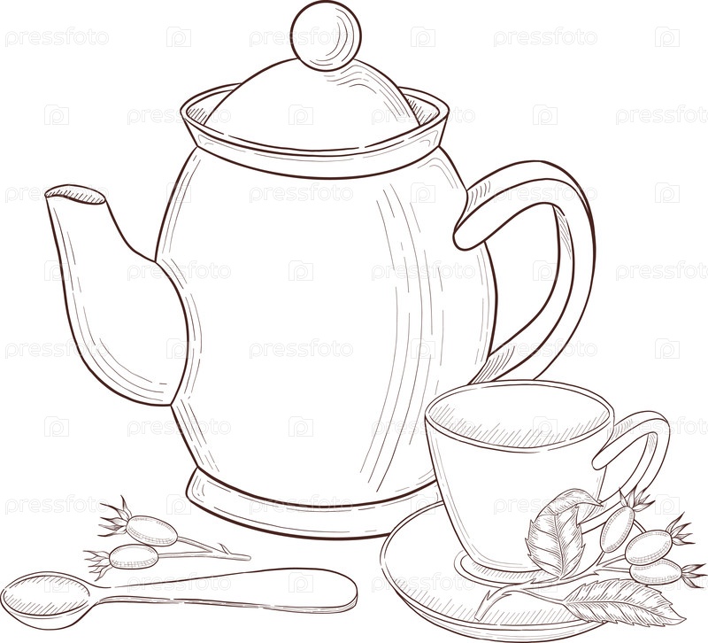 Иллюстрационный набор в черно-белом стиле гравировки чашки с чаем, чайника, листьев чая, чайного мешка и цветов розового хепа и ягод, подробная линия работы для упаковки, социальных сетей, меню