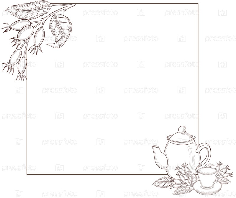 Иллюстрационный набор в черно-белом стиле гравировки чашки с чаем, чайника, листьев чая, чайного мешка и цветов розового хепа и ягод, подробная линия работы для упаковки, социальных сетей, меню