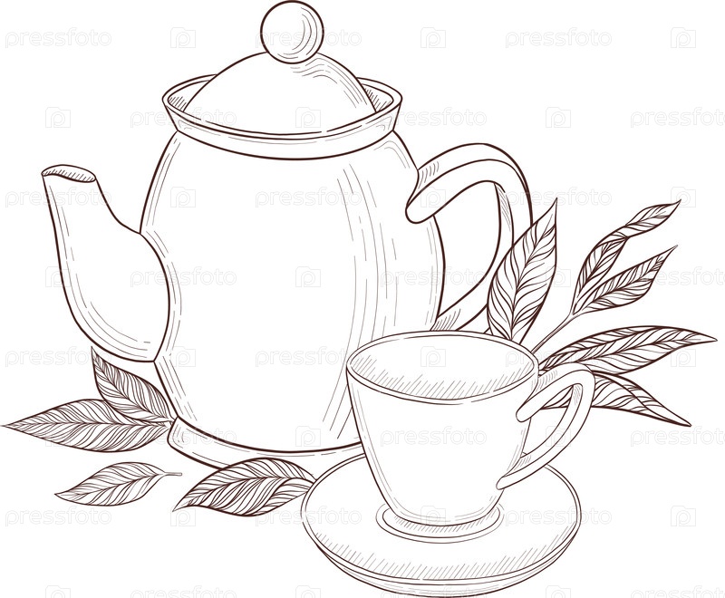 Иллюстрационный набор в черно-белом стиле гравировки чашки с чаем, чайника, листьев чая, чайного мешка и цветов розового хепа и ягод, подробная линия работы для упаковки, социальных сетей, меню