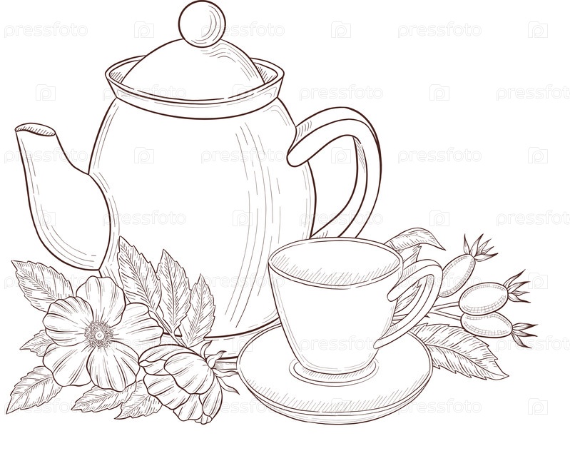 Иллюстрационный набор в черно-белом стиле гравировки чашки с чаем, чайника, листьев чая, чайного мешка и цветов розового хепа и ягод, подробная линия работы для упаковки, социальных сетей, меню