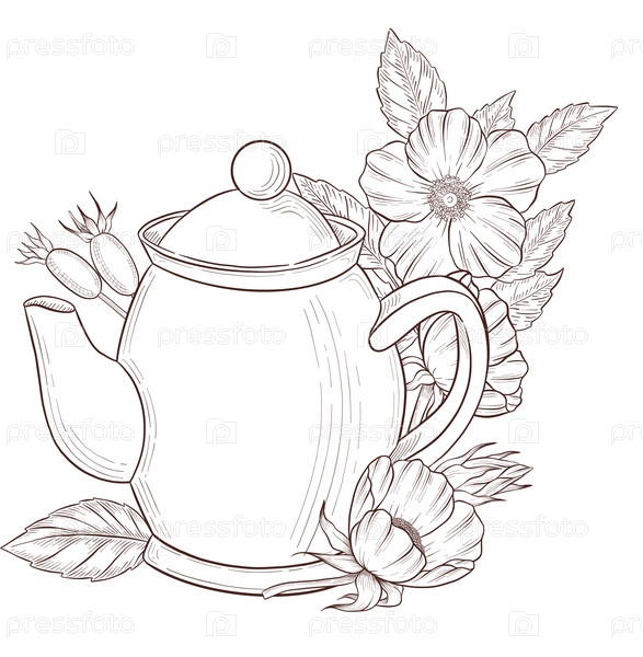 Иллюстрационный набор в черно-белом стиле гравировки чашки с чаем, чайника, листьев чая, чайного мешка и цветов розового хепа и ягод, подробная линия работы для упаковки, социальных сетей, меню