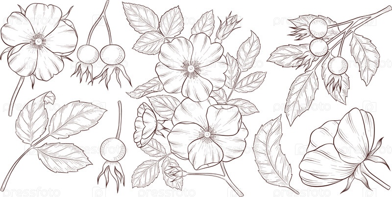 Иллюстрационный набор в черно-белом стиле гравировки чашки с чаем, чайника, листьев чая, чайного мешка и цветов розового хепа и ягод, подробная линия работы для упаковки, социальных сетей, меню