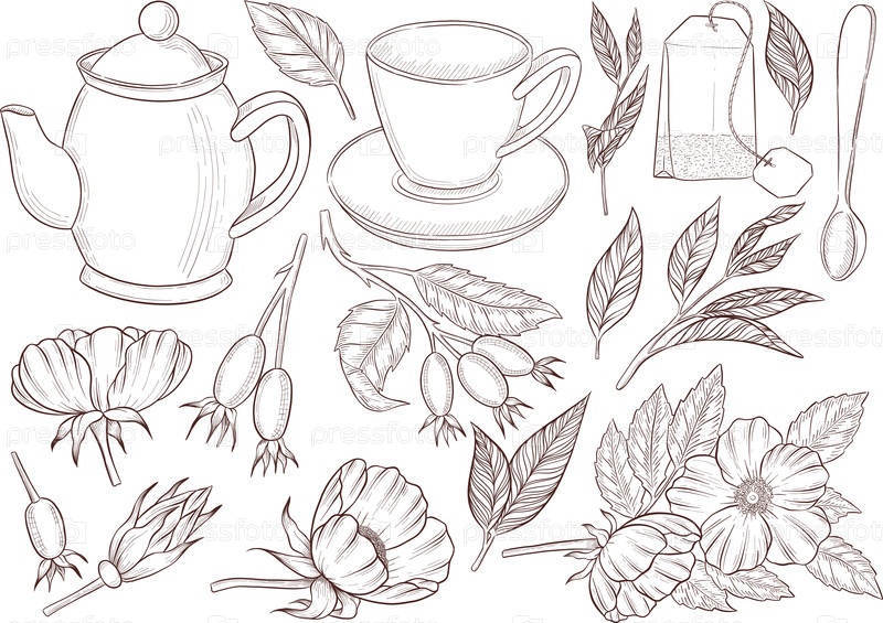 Иллюстрационный набор в черно-белом стиле гравировки чашки с чаем, чайника, листьев чая, чайного мешка и цветов розового хепа и ягод, подробная линия работы для упаковки, социальных сетей, меню