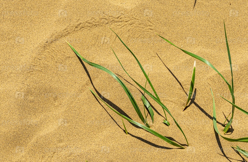 Легкий ветерок колышет зеленую траву на золотистых песчаных дюнах