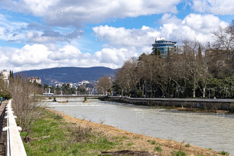Безмятежный вид на реку в Сочи с современной архитектурой и облаками