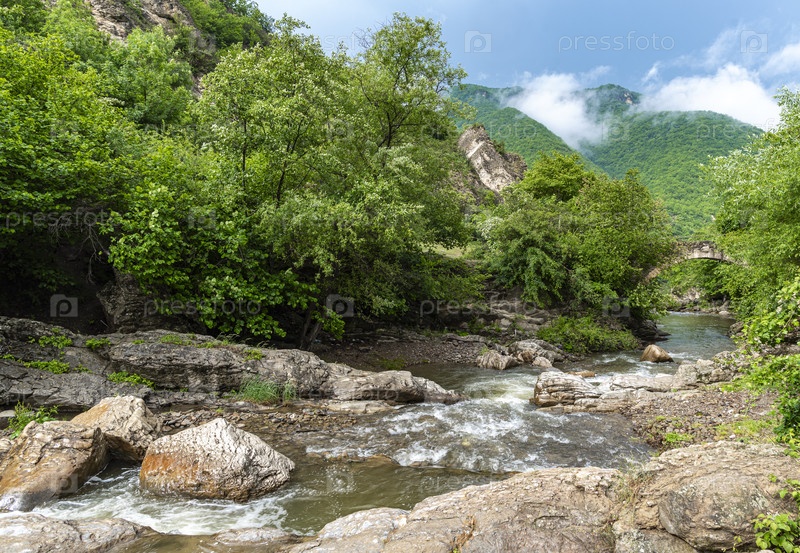 Горная река среди зеленого леса и скал